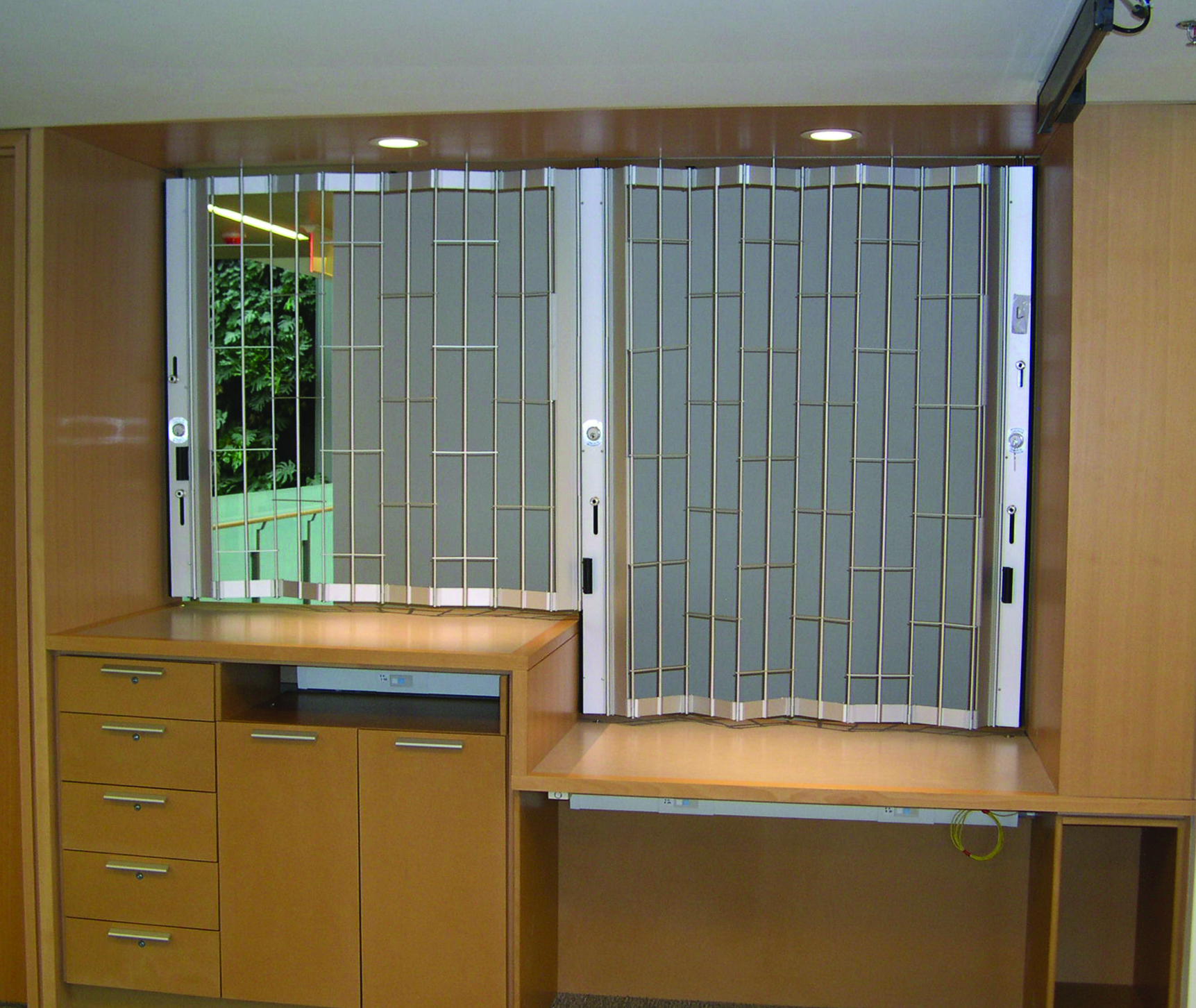 Side folding grilles require less headroom clearance than rolling grilles. The VisionGlide™ curtain is formed with a series of vertical 5/16" diameter aluminum rods on 3.5" centers. Horizontal chains formed of eyeletted aluminum links are spaced at 12" apart. Vertical hanger rods mounted to rollers that slide in the overhead track support the curtain.